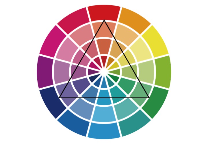 カラーホイールのなかに正三角形を描いた際に各角に位置する3つの色のことをトライアディック・カラーと言います。