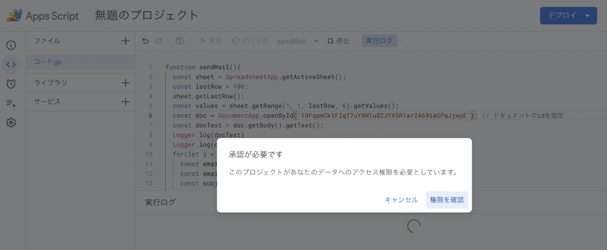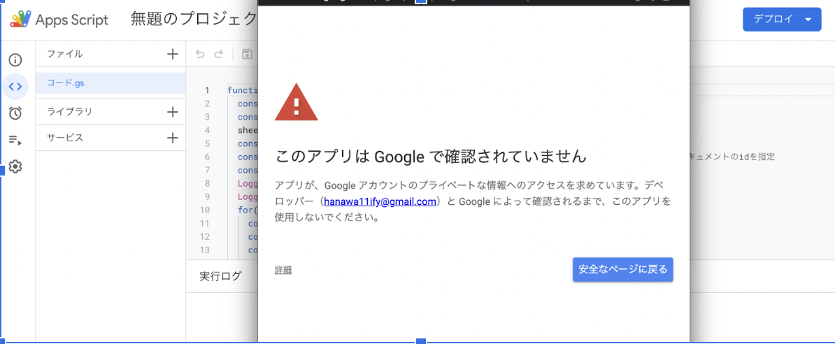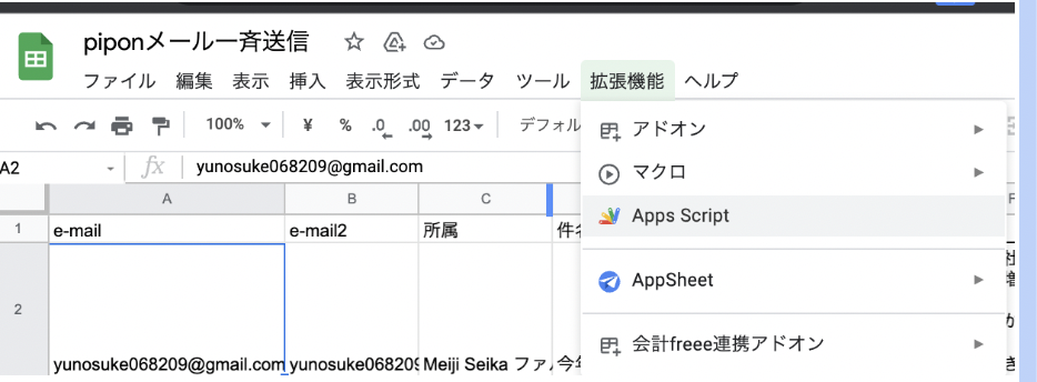 【Step2】スプレッドシートの拡張機能->Apps Scriptをクリックしてこのリンク先のプログラムをコピペする