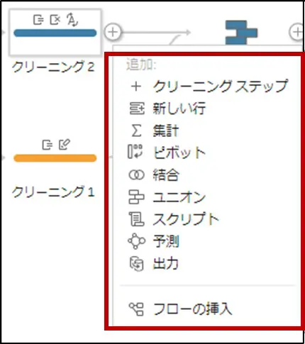 データソースを繋げたら、「クリーニングステップ」でデータソースの追加、ピボット作成、結合などを行います。不必要なデータの削除、型の変換、欠損データの処理も簡単にできます。値のグループ化や置換もマウス操作で可能です。