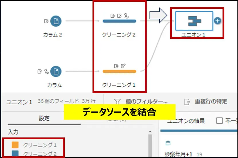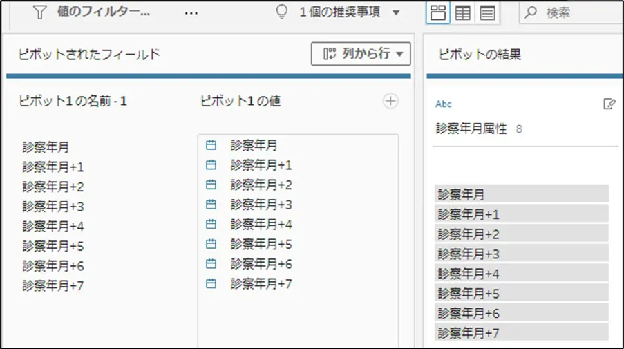 ここでTableau Prep Builderを使い、「診察年月」「診察年月+1か月」「診察年月+2か月」などの指標を作成し、ピボット機能で日付を1つに集約します。
