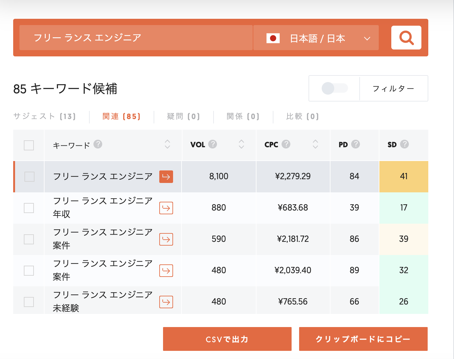 例えば、検索ボリュームが多い「フリーランス エンジニア」をUberSuggestで検索すると、「フリーランス エンジニア 年収」などのキーワードプランナーで発見できなかったキーワード見つけることができます。
