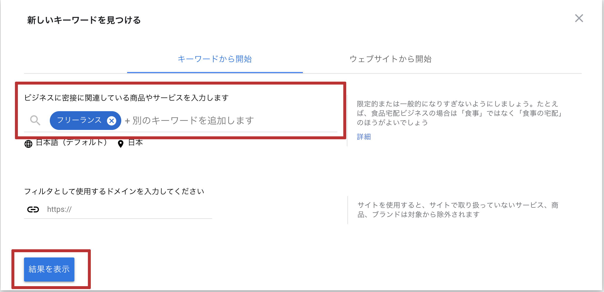 キーワードプランナーの「新しいキーワードを見つける」の欄に、キーワードを入力し、「結果を表示」をクリックします。