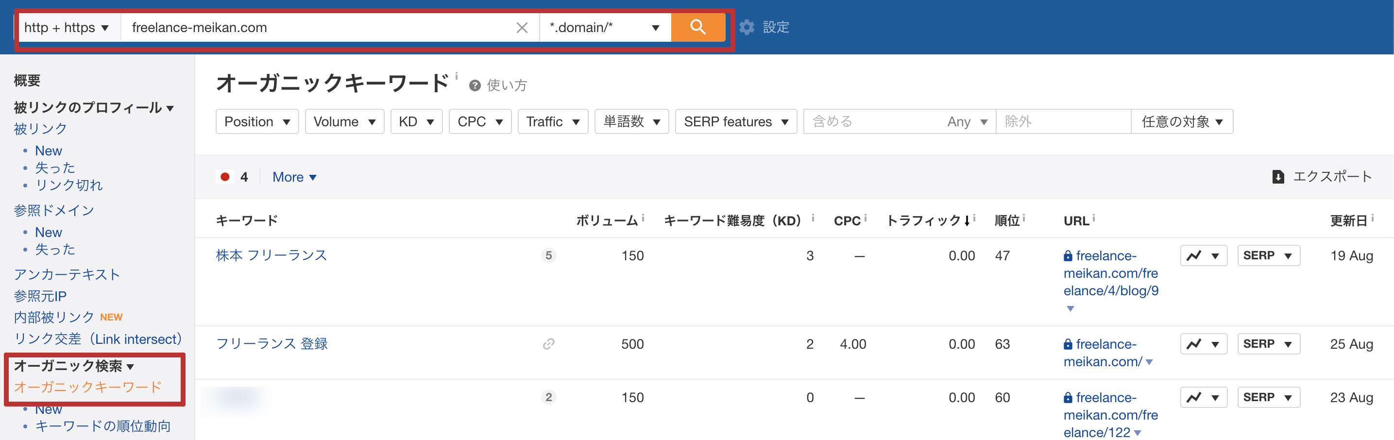 すると、競合サイトの情報が表示されますので、左メニューから「オーガニックキーワード」をクリックします。競合の流入キーワードを見ることができますので、手順①、③で洗い出せていないキーワードを発見した場合は、シートに追加していきます。