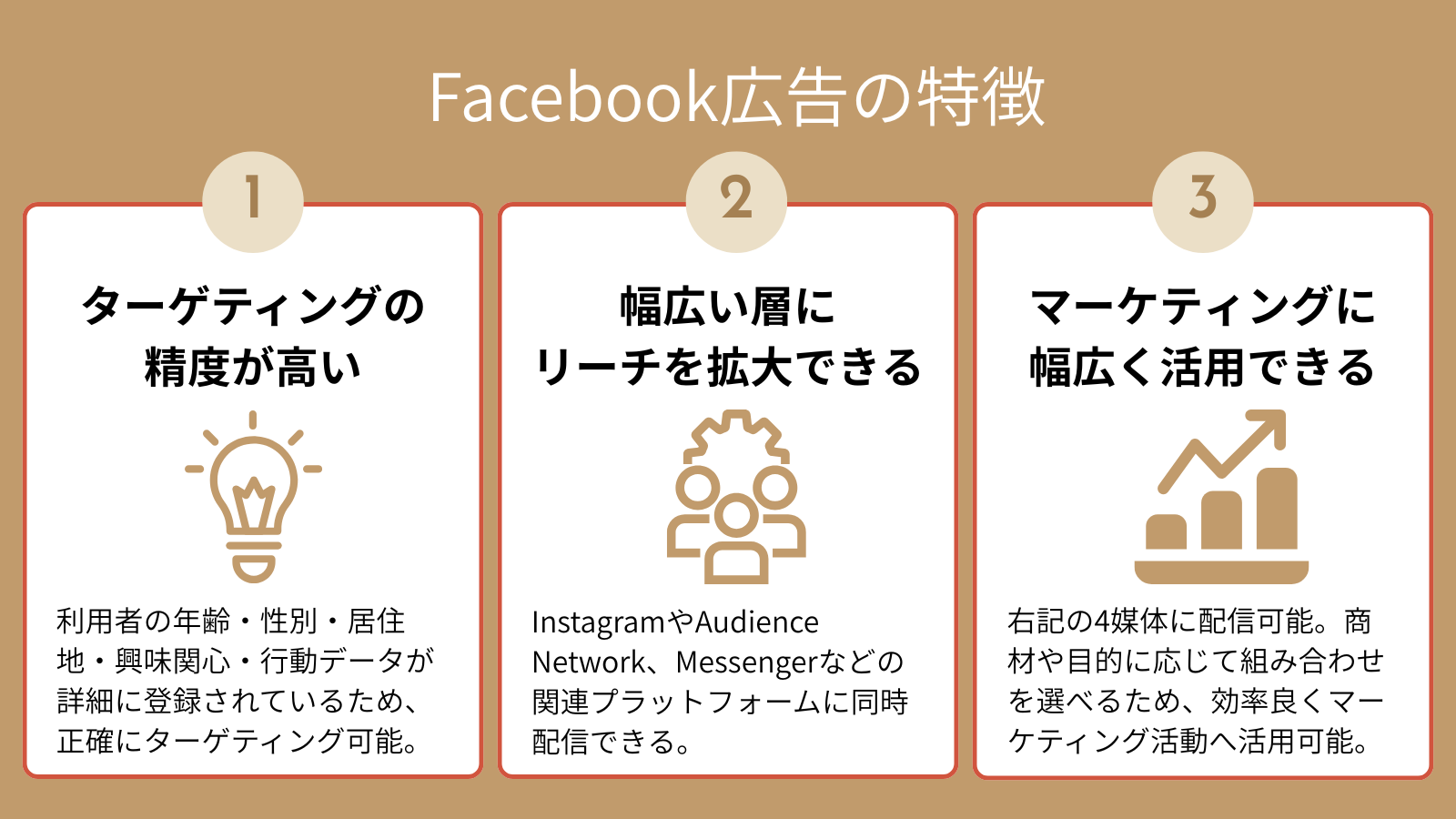 Facebook広告は、世界的に利用されているSNS「Facebook」をはじめとし、InstagramやMessengerなどの関連サービスに配信できる広告プラットフォームです。