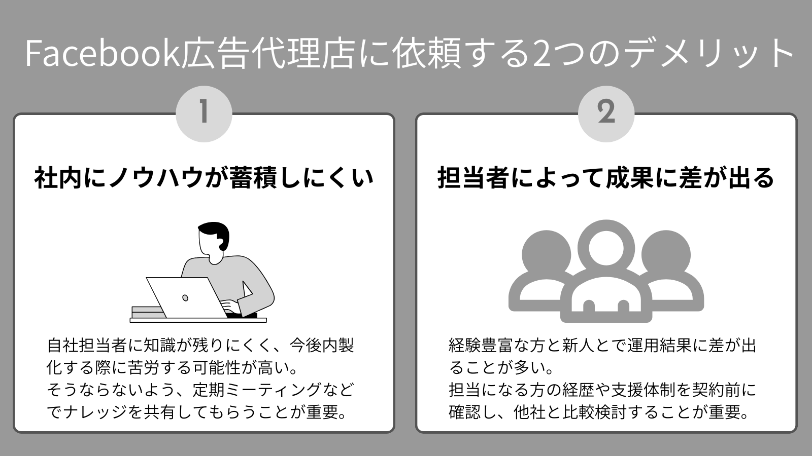 この点を補うためには、提出される運用レポートの内容をしっかり確認したり、Facebook広告代理店との定期ミーティングを通じてナレッジを共有してもらう仕組みを整えることが有効です。