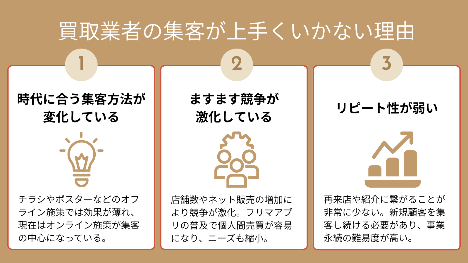 また、買取業はリピート性が弱く、広告で一時的に集客できても再来店や紹介につながりにくいという課題があります。こうした背景から、従来の手法だけでは継続的な集客が難しくなっています。