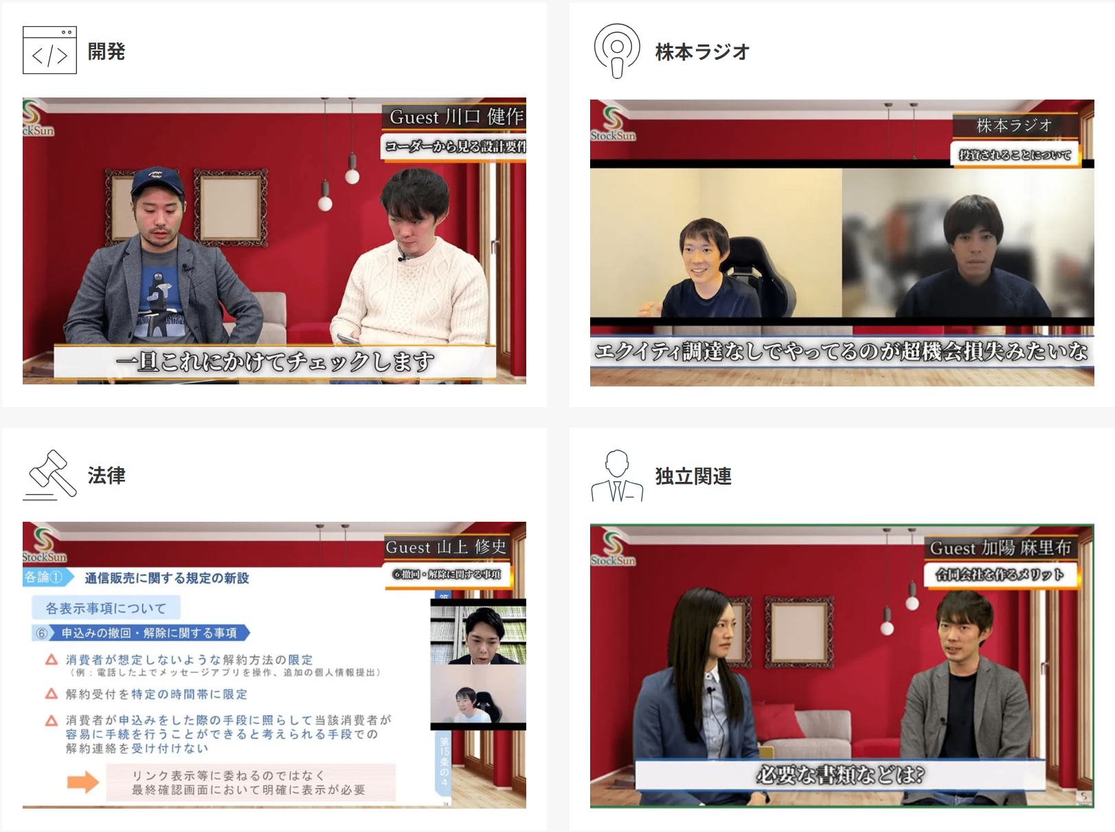 StockSunサロンでは、年収チャンネルやStockSunの裏側を知れる株本ラジオ、SEOやセールスが学べる無料講義を用意しています。サロンメンバーなら、全ての動画をいつでも視聴可能です。