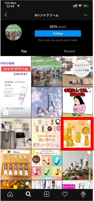 <ハッシュタグ 「ハンドクリーム」で上位掲載している例>