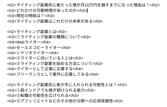 ただ、最初期の頃に『h2』以降を使った記事は中々書くことが難しいので、まずは『h2』タグを使って500文字〜1000文字のライティングを始めてみましょう。