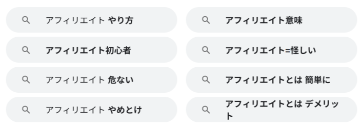 サジェストキーワードを見つけるのは非常に簡単で、例えばアフィリエイトというキーワードでグーグル検索すると以下のキーワード群がでてきます。
