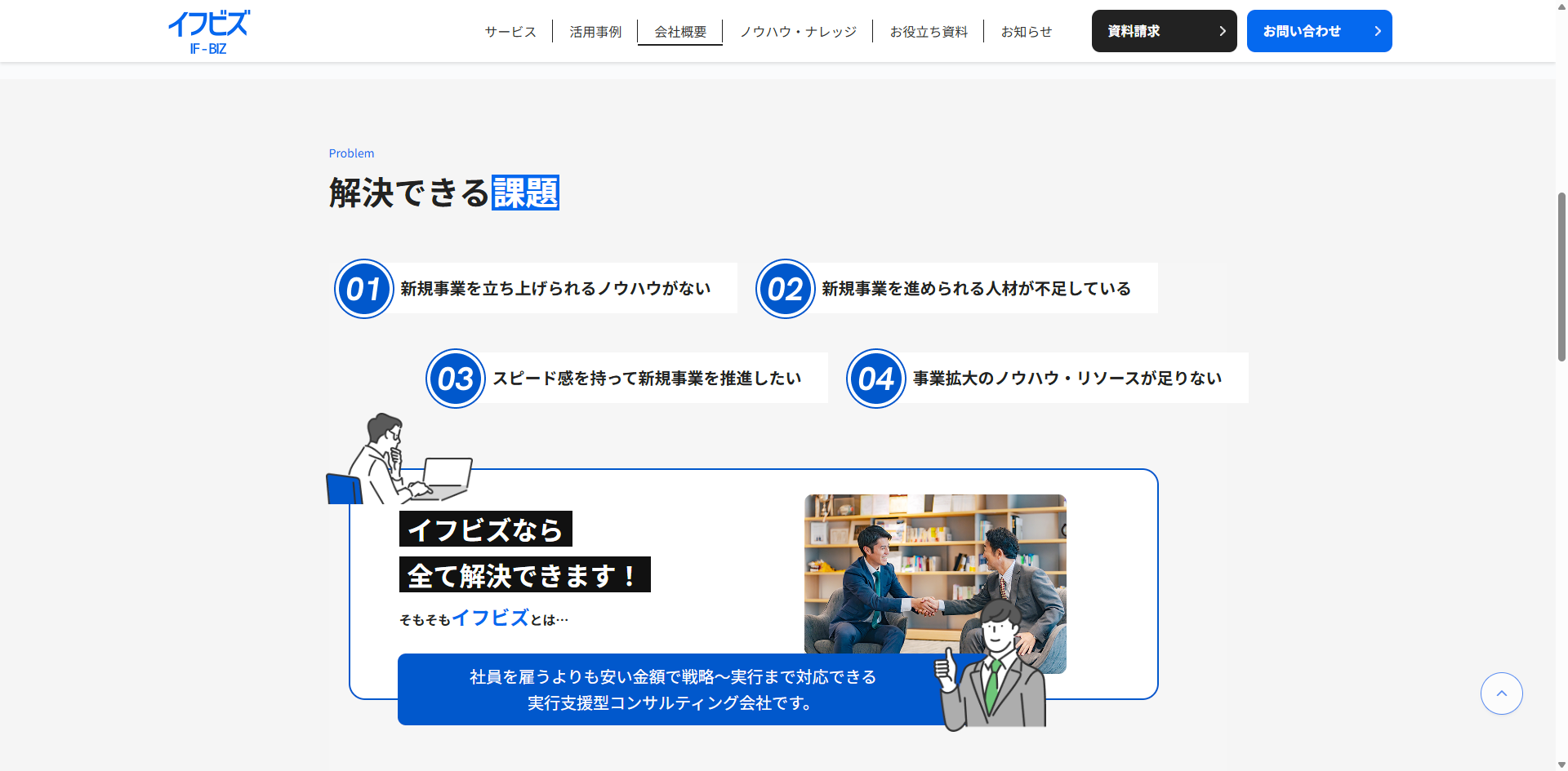 イフビズ様は「実行支援型ビジネスパートナー」として、マーケティング支援・新規事業の立ち上げ・LP/クリエイティブ制作を通じて、企業の売上拡大や事業成長を支援されてるコンサルティング会社です。