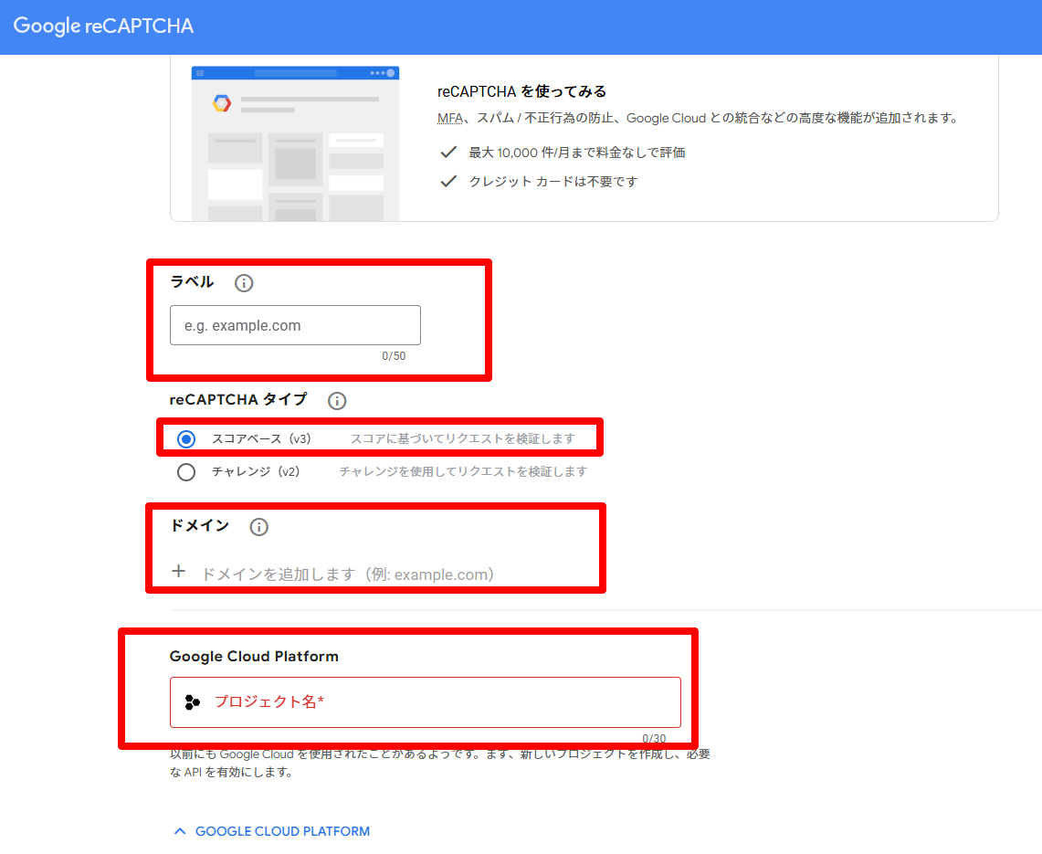 1. Google reCAPTCHA のサイトキーとシークレットキーを取得