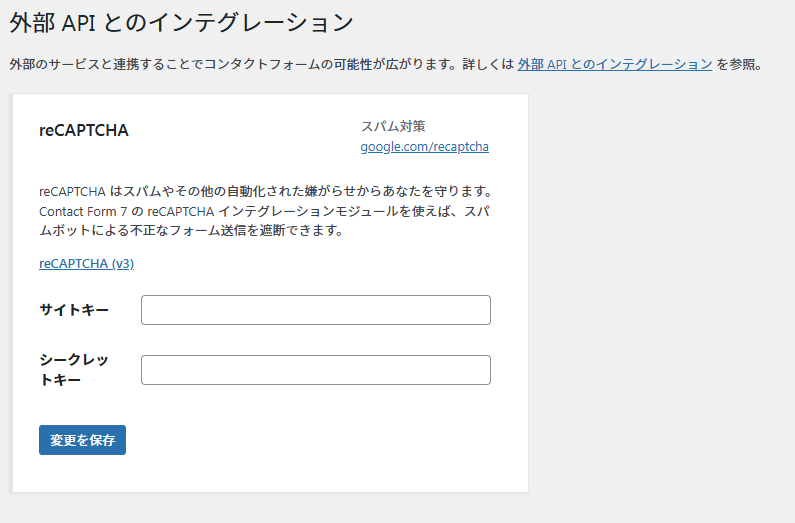 - reCAPTCHAバージョン:v3(右下にバッジが出るタイプ)
