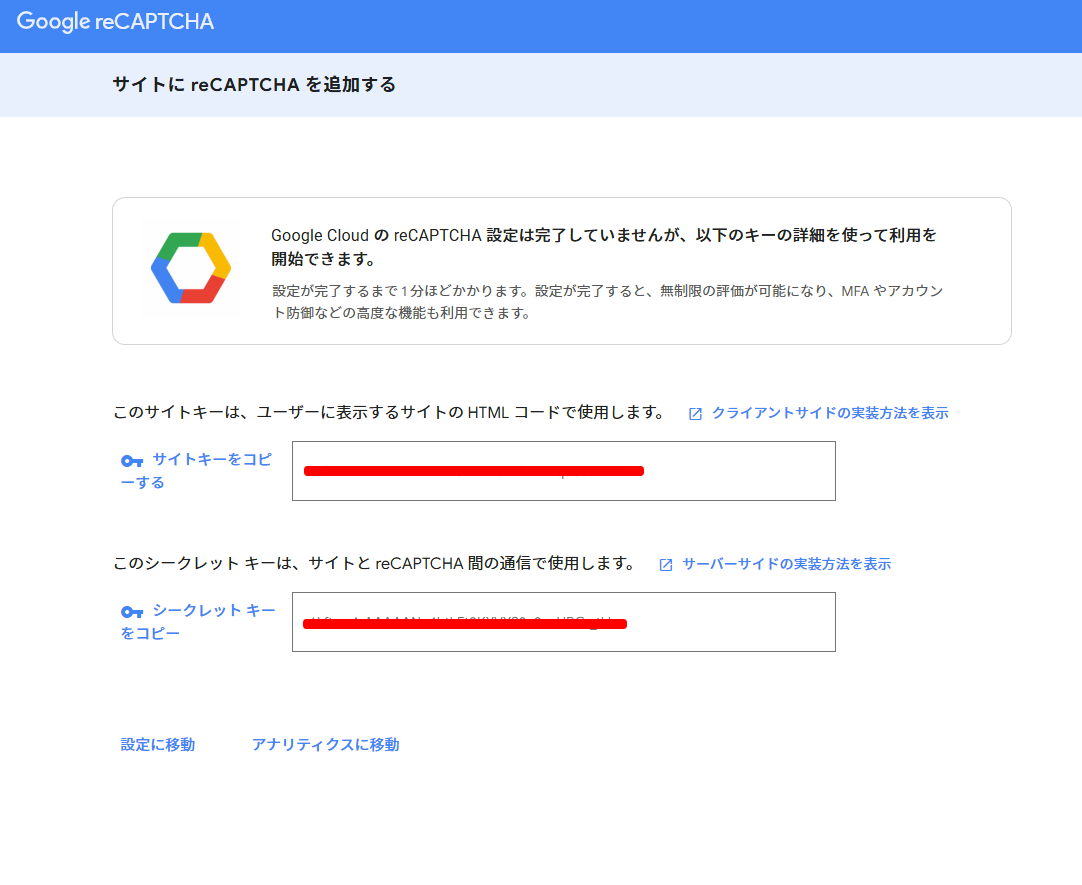 - 「サイトキー」「シークレットキー」が表示されるのでコピーしておく