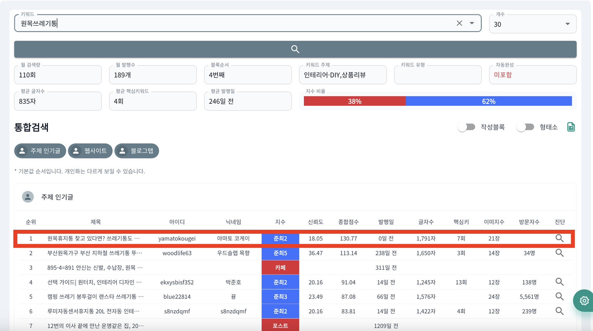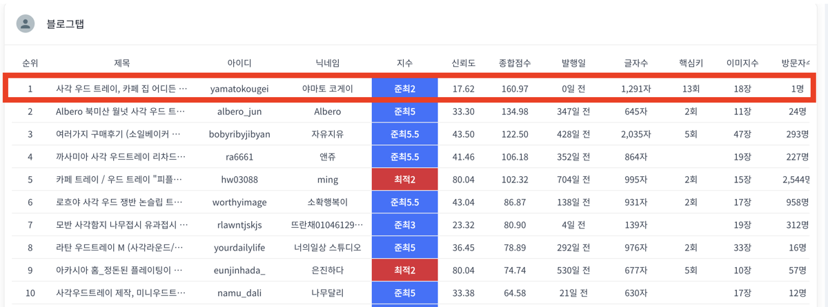 ブログは最初に始めたのブログ指数が非常に低いため、上位露出のためには小さなキーワードから少しずつターゲティングすることが重要です。