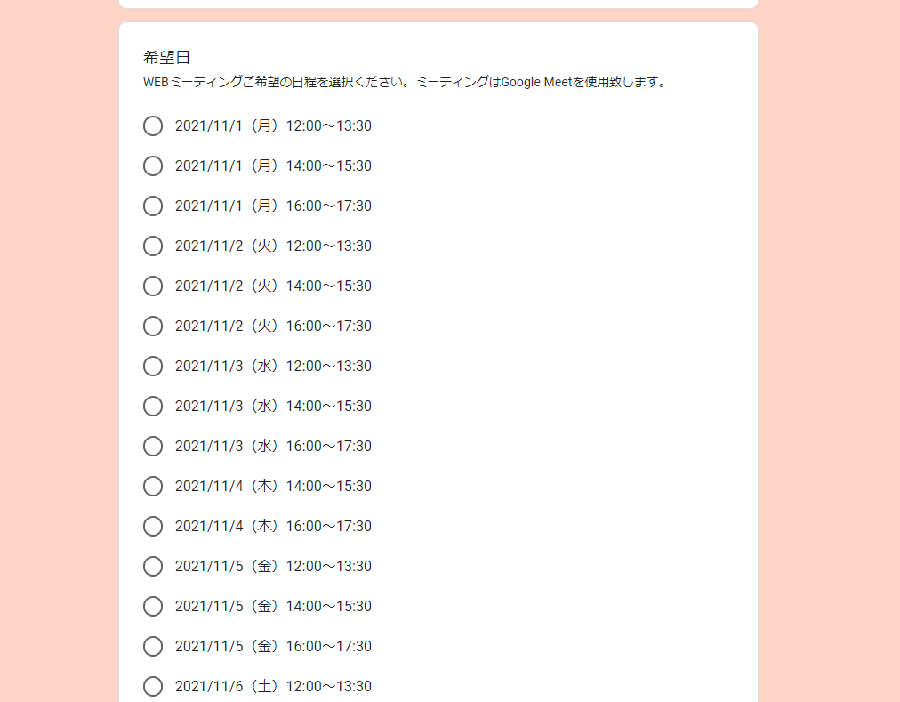 フォームをご覧いただくと、項目「希望日」に日時が沢山並んでいます。