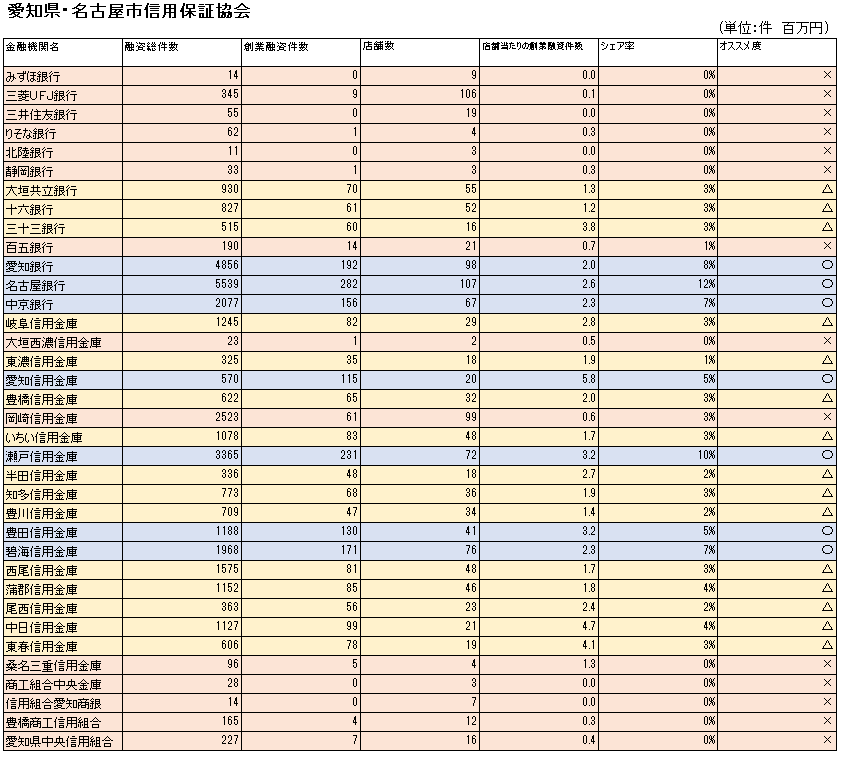 愛知県・名古屋市の保証協会を利用した融資がない金融機関となります。